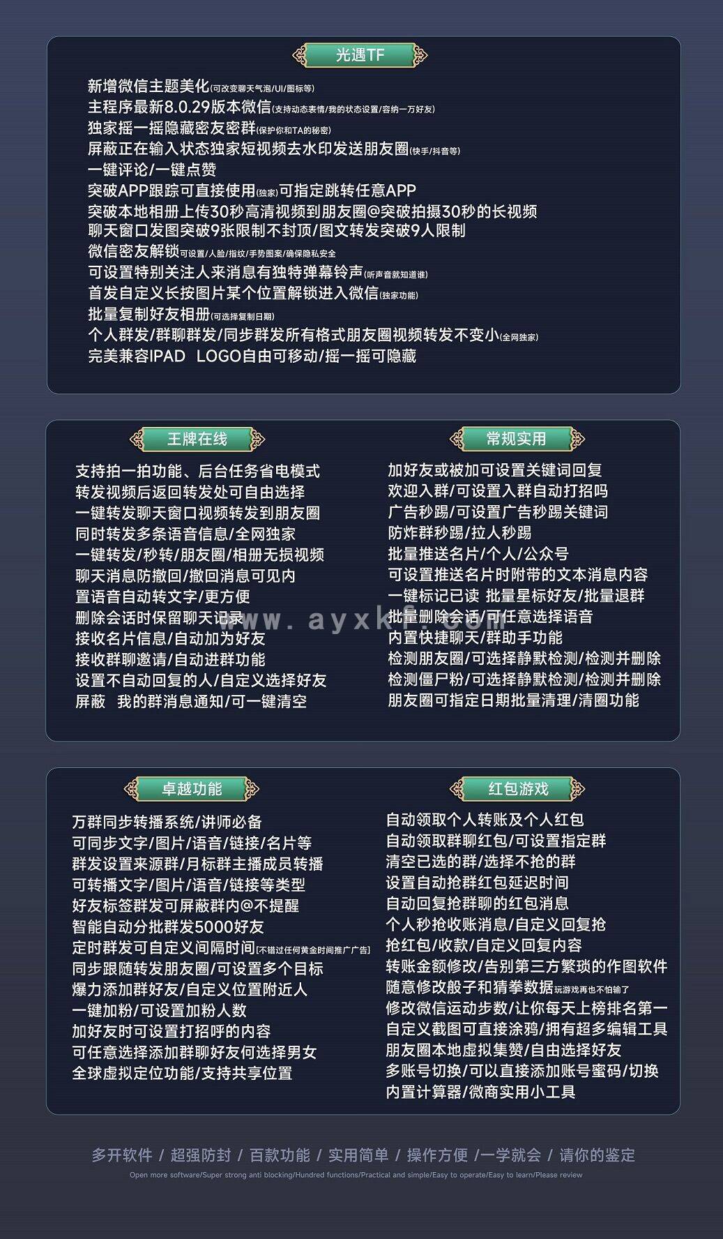 一键转发/秒转/朋友圈/相册无损视频批量推送名片/个人/公众号聊天消息防撤回/撤回消息可见内可设置推送名片时附带的文本消息内容置语音自动转文字/更方便一键标记已读批量星标好友/批量退群删除会话时保留聊天记录批量删除会话/可任意选择语音接收名片信息/自动加为好友内置快捷聊天/群助手功能接收群聊邀请/自动进群功能检测朋友圈/可选择静默检测/检测并删除设置不自动回复的人/自定义选择好友检测僵尸粉/可选择静默检测/检测并删除屏蔽我的群消息通知/可一键清空朋友圈可指定日期批量清理/清圈功能